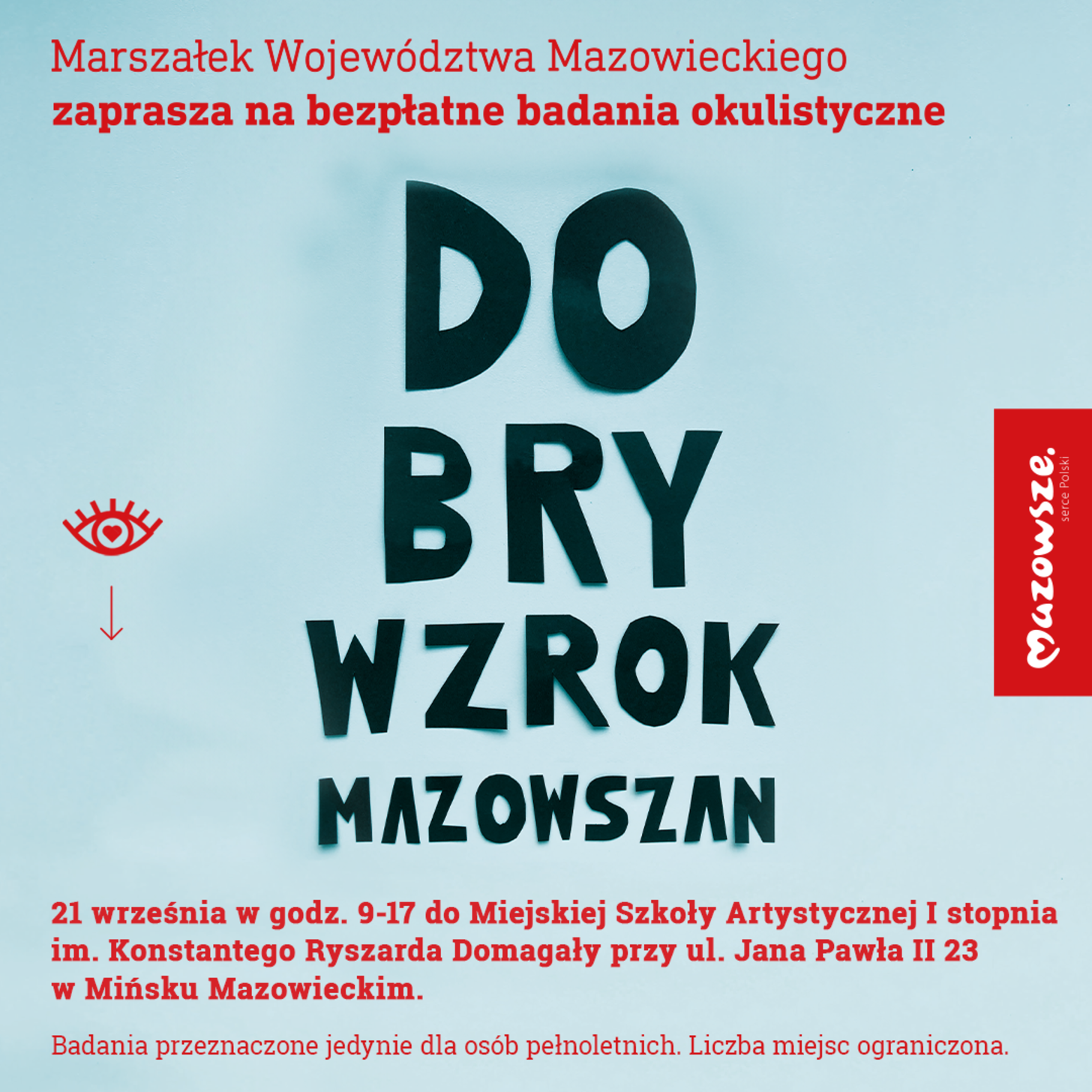 Samorząd województwa mazowieckiego zaprasza dorosłych mieszkańców powiatu mińskiego na darmowe przesiewowe badania wzroku. Aby wziąć w nich udział, nie jest potrzebne skierowanie od lekarza. Wystarczy przyjść w niedzielę, 21 września do Miejskiej Szkoły Artystycznej I stopnia im. Konstantego Ryszarda Domagały w Mińsku Mazowieckim przy ul. Jana Pawła II 23.