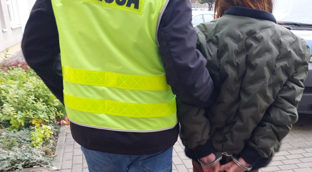 Zdjęcie przedstawia policjanta ubranego w seledynową kamizelkę, który prowadzi po swojej prawej stronie zatrzymaną kobietę. Kobieta ta ma kajdanki na rękach.