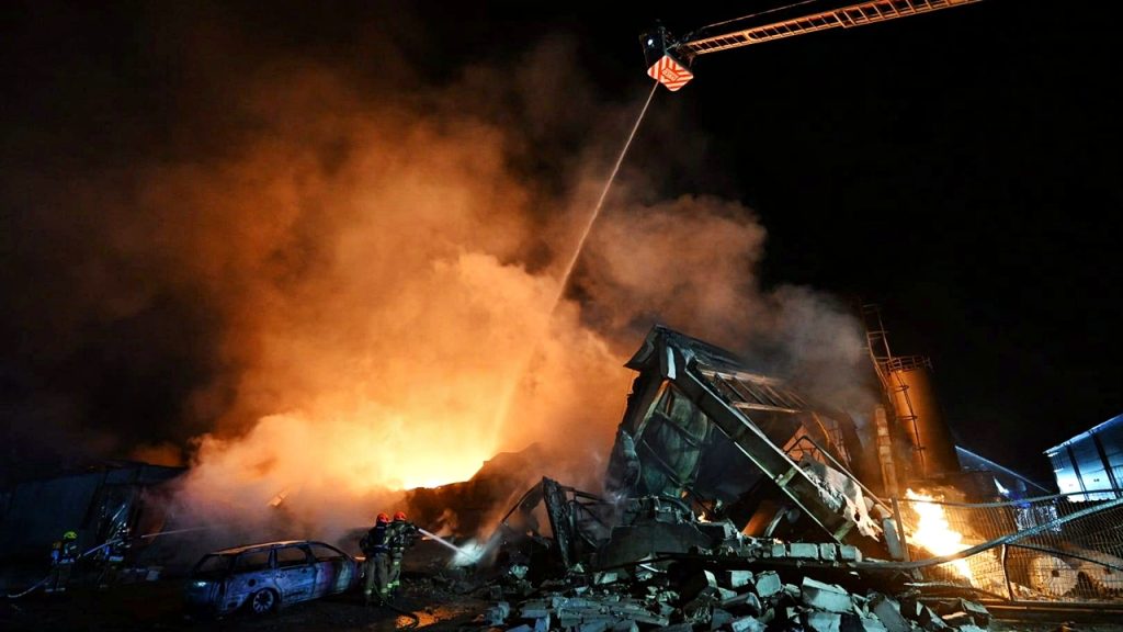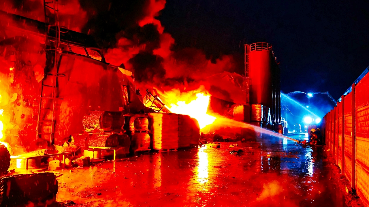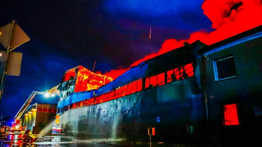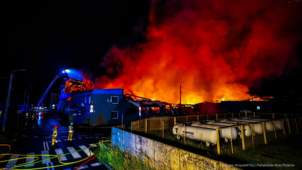 Pożarem objęta jest hala produkcyjno-magazynowa o wymiarach 80×50 metrów, w której produkowano opakowania foliowe. Obiekt cały objęty ogniem.
