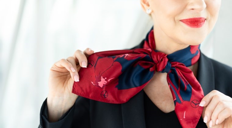 Od teraz stewardesy zobaczymy w białych apaszkach w czerwone malwy, z granatową lamówką, natomiast szefowe pokładu – w wersji z granatowym tłem w czerwone kwiaty i czerwoną lamówką. Z kolei personel naziemny otrzymał białe apaszki w czerwone kwiaty i czerwonym brzegiem. Analogiczne wzory mają nowe poszetki panów z personelu pokładowego i naziemnego. Krawaty stewardów w kolorze lotowskiego granatu, zdobi print w drobne czerwone żurawie, a krawaty szefów pokładu będą czerwone z printem granatowych żurawi. Natomiast panowie z personelu naziemnego będą nosić czerwone krawaty z pojedynczym symbolem żurawia.