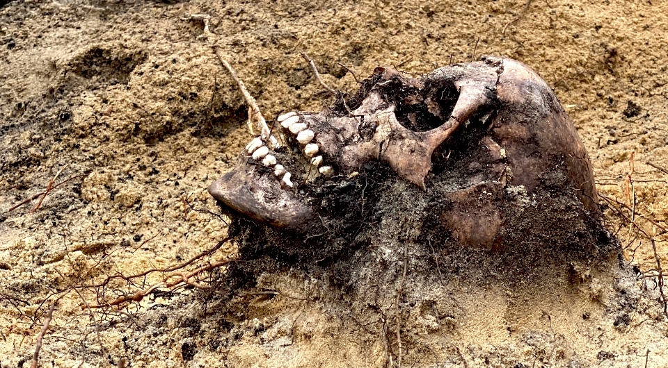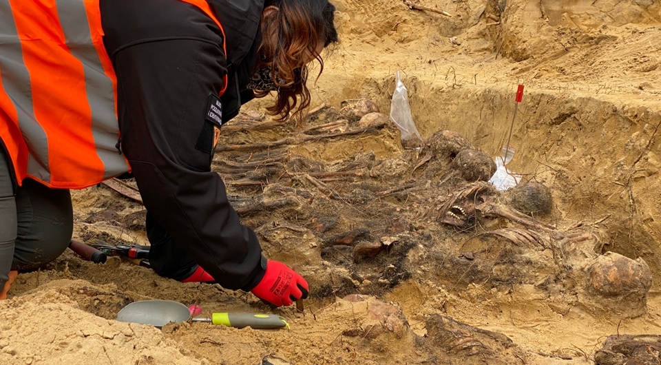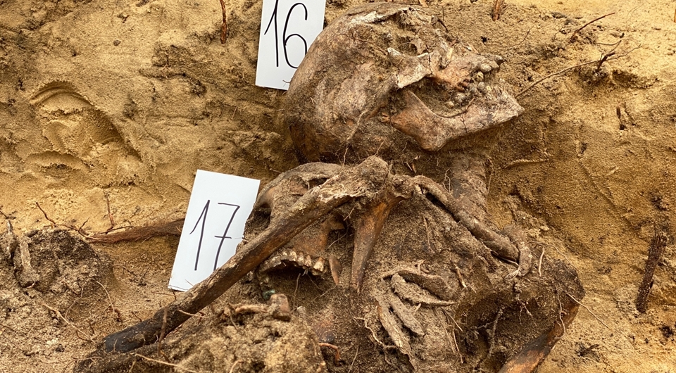 Obszar do badania wytypowano na podstawie wizji lokalnej przeprowadzonej w miejscu wskazanym przez świadka zbrodni. Jama grobowa o powierzchni ponad 13 m. kw. i głębokości 1,3 m. została zlokalizowana w wąwozie pomiędzy wydmami. Już w drugim dniu prac ujawniono pierwsze szkielety, ułożone ściśle, regularnie, w pozycji bocznej, niekiedy naprzemiennie. Podczas dalszego odsłaniania jamy grobowej ukazały się kolejne szczątki osób, których ciała wrzucono bezwładnie do grobu. Pośród szczątków osób dorosłych zostały odkryte szczątki dzieci, a także niemowląt. Wstępne badanie antropologiczne przeprowadzone przez specjalistów Biura Poszukiwań i Identyfikacji na miejscu prac pozwoliło ustalić, iż w tym miejscu pogrzebano ciała 35 osób, w tym 3 mężczyzn, 16 kobiet i 14 dzieci (w wieku od ok. 1 r.ż. do 14 r.ż.). Wiek i płeć pozostałych dwóch osób pozwolą ustalić oględziny antropologiczne przeprowadzone w najbliższym czasie. Przy niektórych szkieletach odnaleziono elementy odzieży (buty, paski, guziki, okulary).