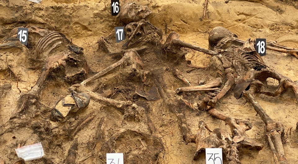 Podczas podejmowania szczątków zostały ujawnione pociski broni palnej (krótkiej i długiej) umiejscowione m.in. w czaszkach oraz kości miednicy. Ujawniono także łuski od amunicji typu Mauser.