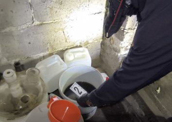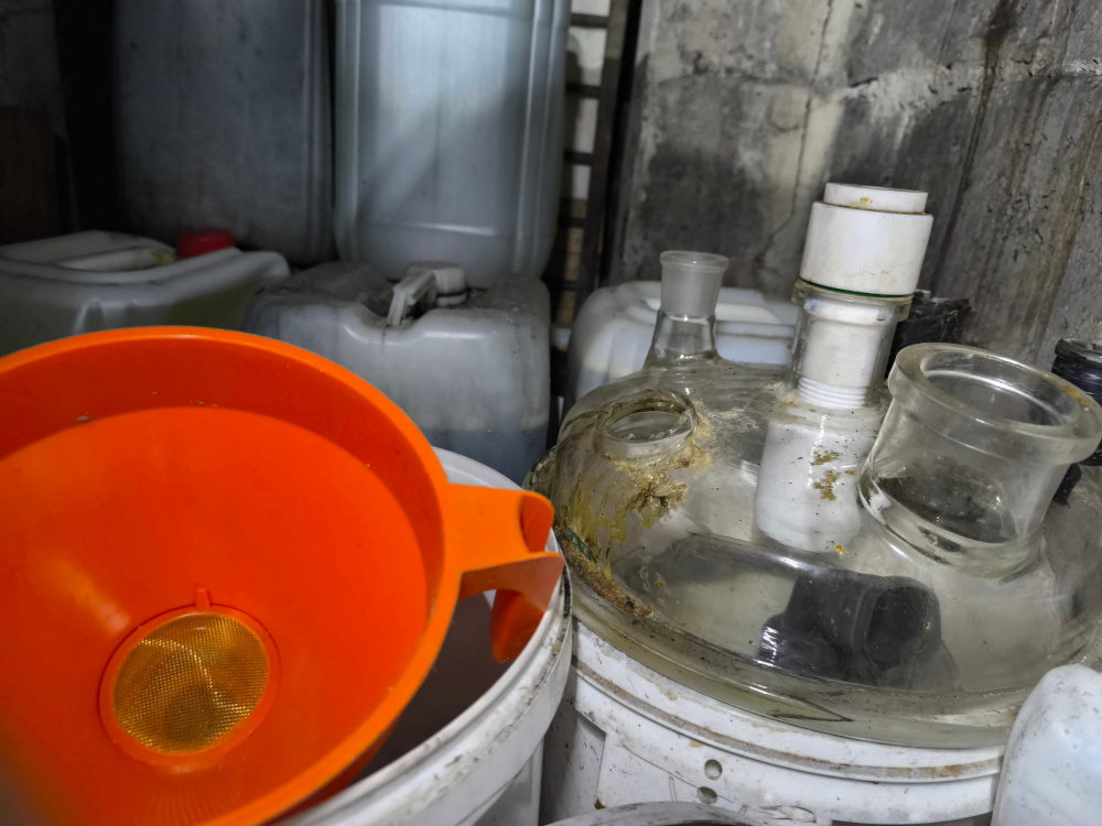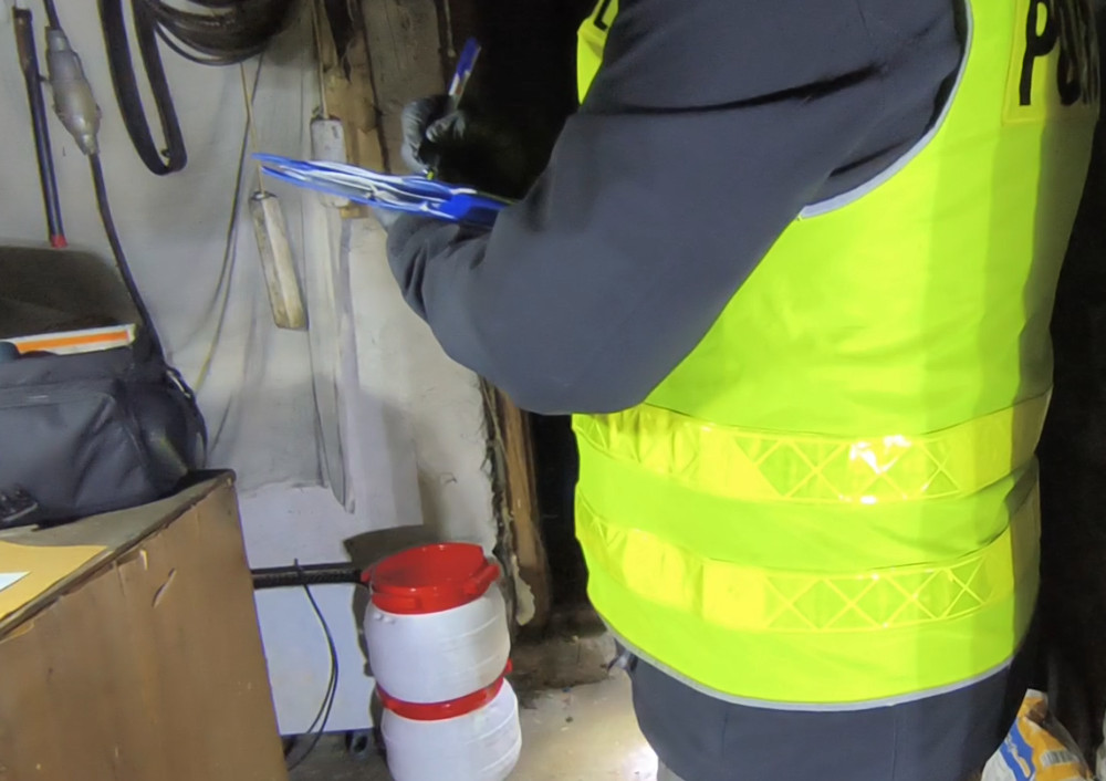 Policjanci w pomieszczeniach gospodarczych odkryli laboratorium do produkcji mefedronu. Zabezpieczyli mefedron, 4-CMC, 4-metylopropiofenon w formie płynnej w ilości około 140 litrów oraz prekursory do produkcji mefedronu. Na miejsce skierowano grupę operacyjno-procesową z technikiem kryminalistyki.