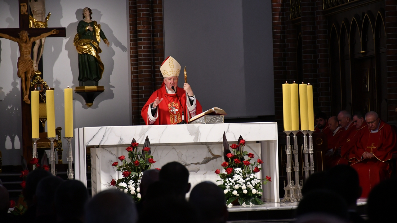 Msza Święta, którą koncelebrował ks. bp. Romuald Kamiński, rozpoczęła się odśpiewaniem hymnu państwowego RP „Mazurka Dąbrowskiego”. W 107. rocznicę odzyskania przez Polskę niepodległości symbolicznie złożono na ołtarzu chleb, polskie kwiaty, a także wino, wodę i hostię białą.